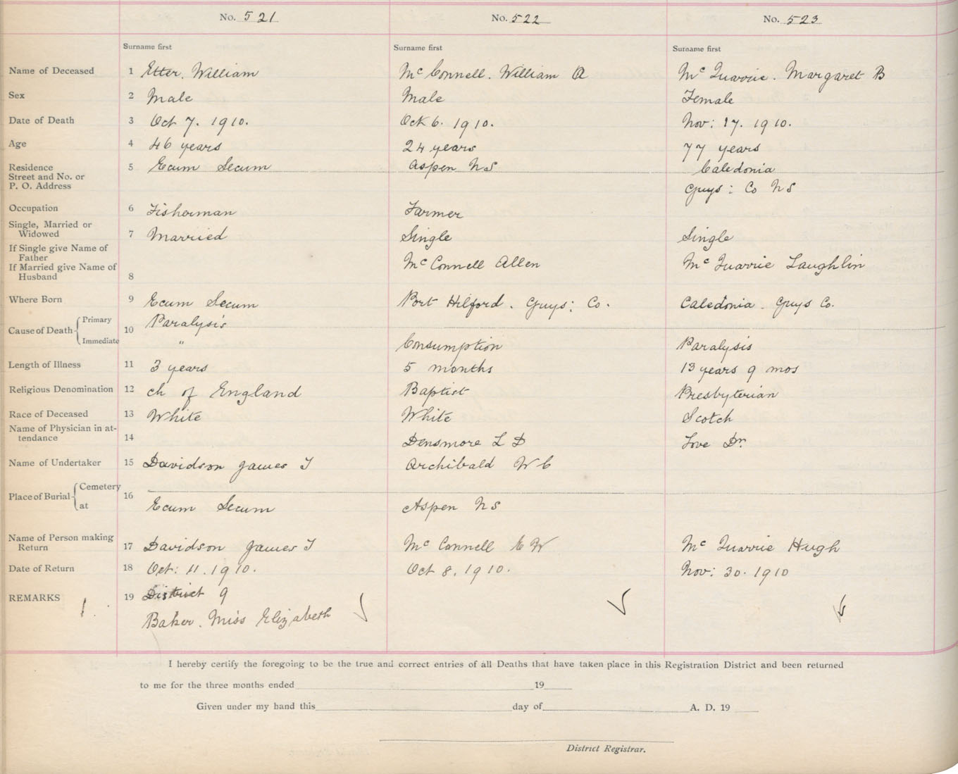 Death Registration: Year: 1910 book: 7 page: 85 number: 523