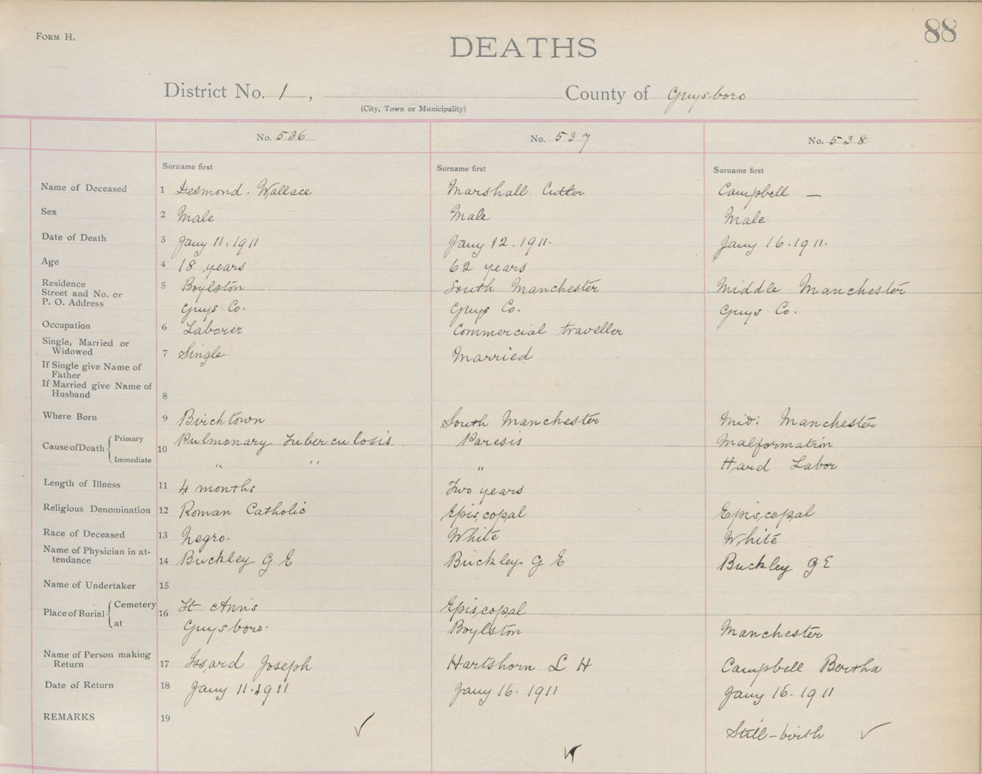 Death Registration: Year: 1911 book: 7 page: 88 number: 538