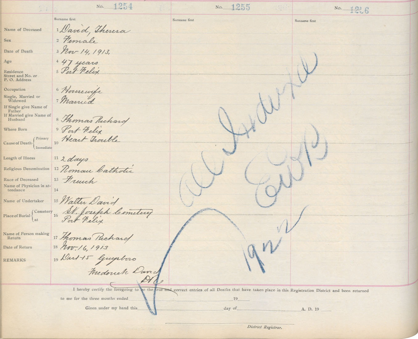 Death Registration: Year: 1913 book: 7 page: 207 number: 1254