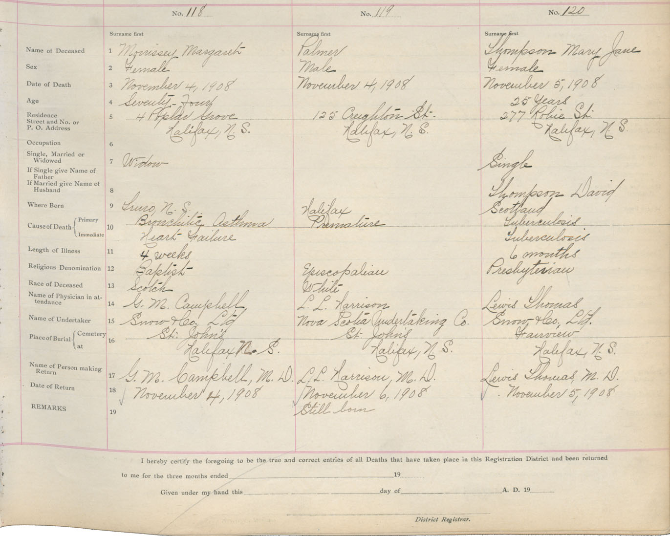 Death Registration: Year: 1908 book: 8 page: 20 number: 118