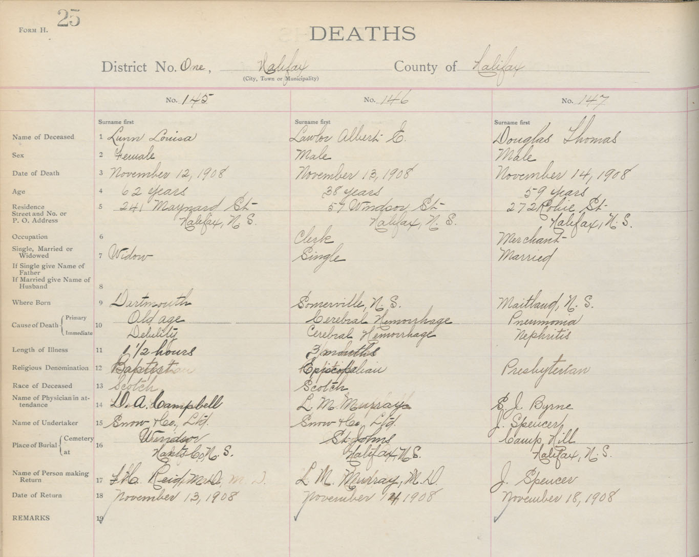 Death Registration: Year: 1908 book: 8 page: 25 number: 145