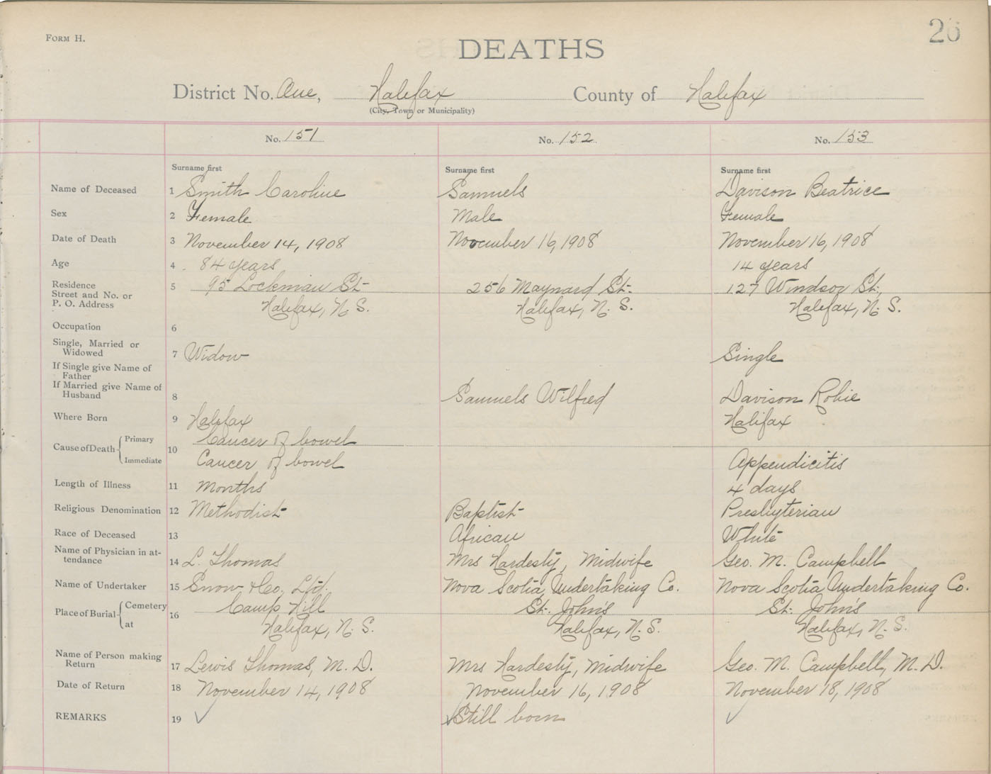 Death Registration: Year: 1908 book: 8 page: 26 number: 151
