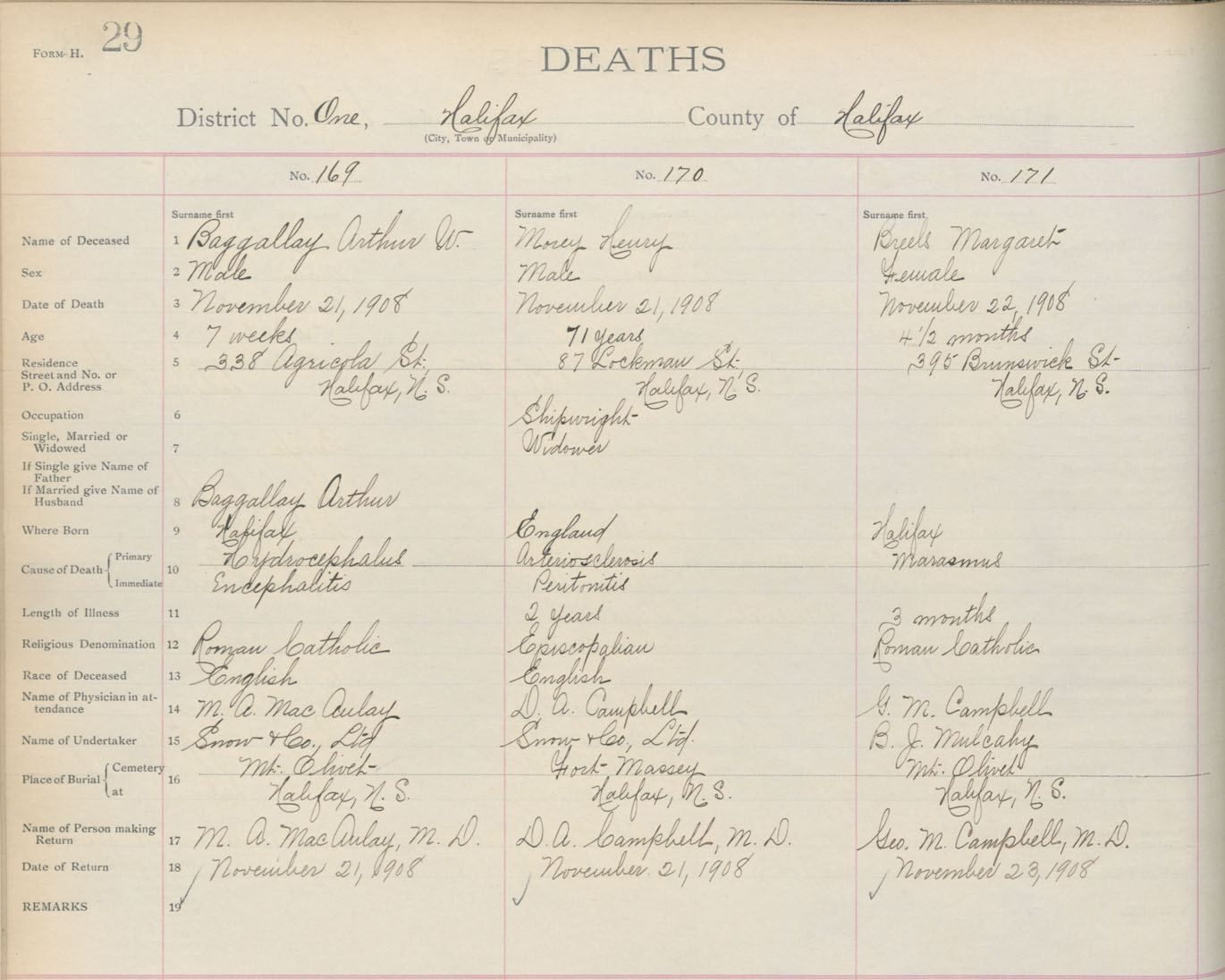 Male Death Registration: Year: 1908 book: 8 page: 29 number: 169