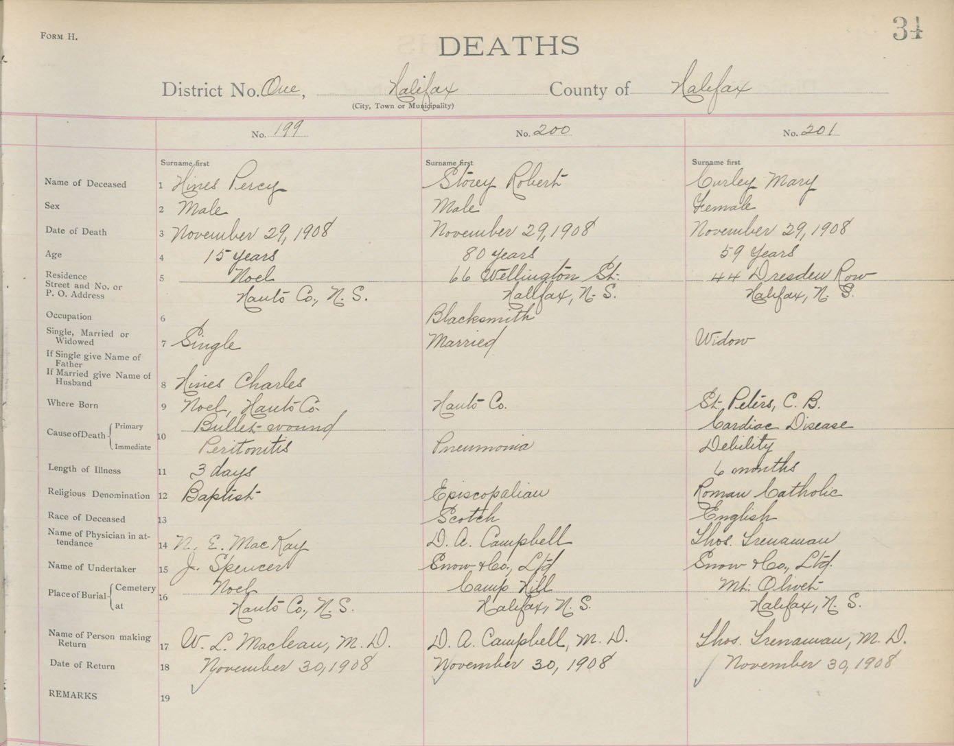 Male Death Registration: Year: 1908 book: 8 page: 34 number: 199