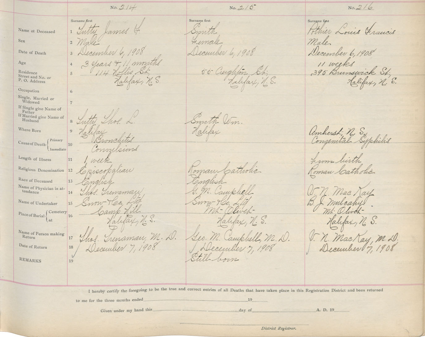 Male Death Registration: Year: 1908 book: 8 page: 36 number: 214