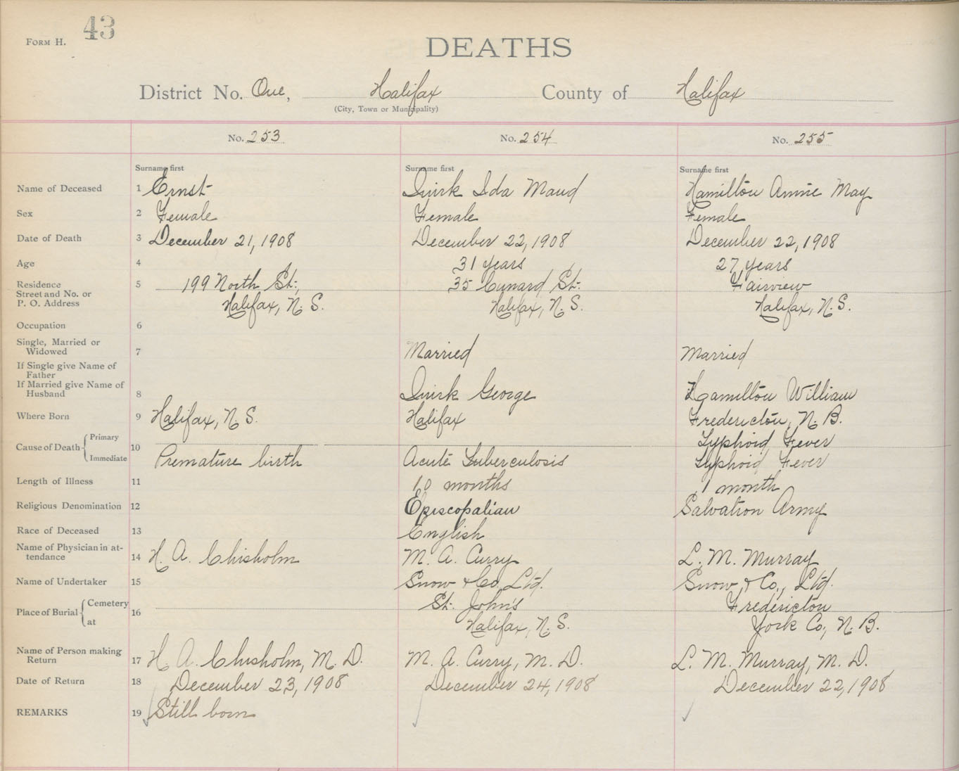 Female Death Registration: Year: 1908 book: 8 page: 43 number: 253