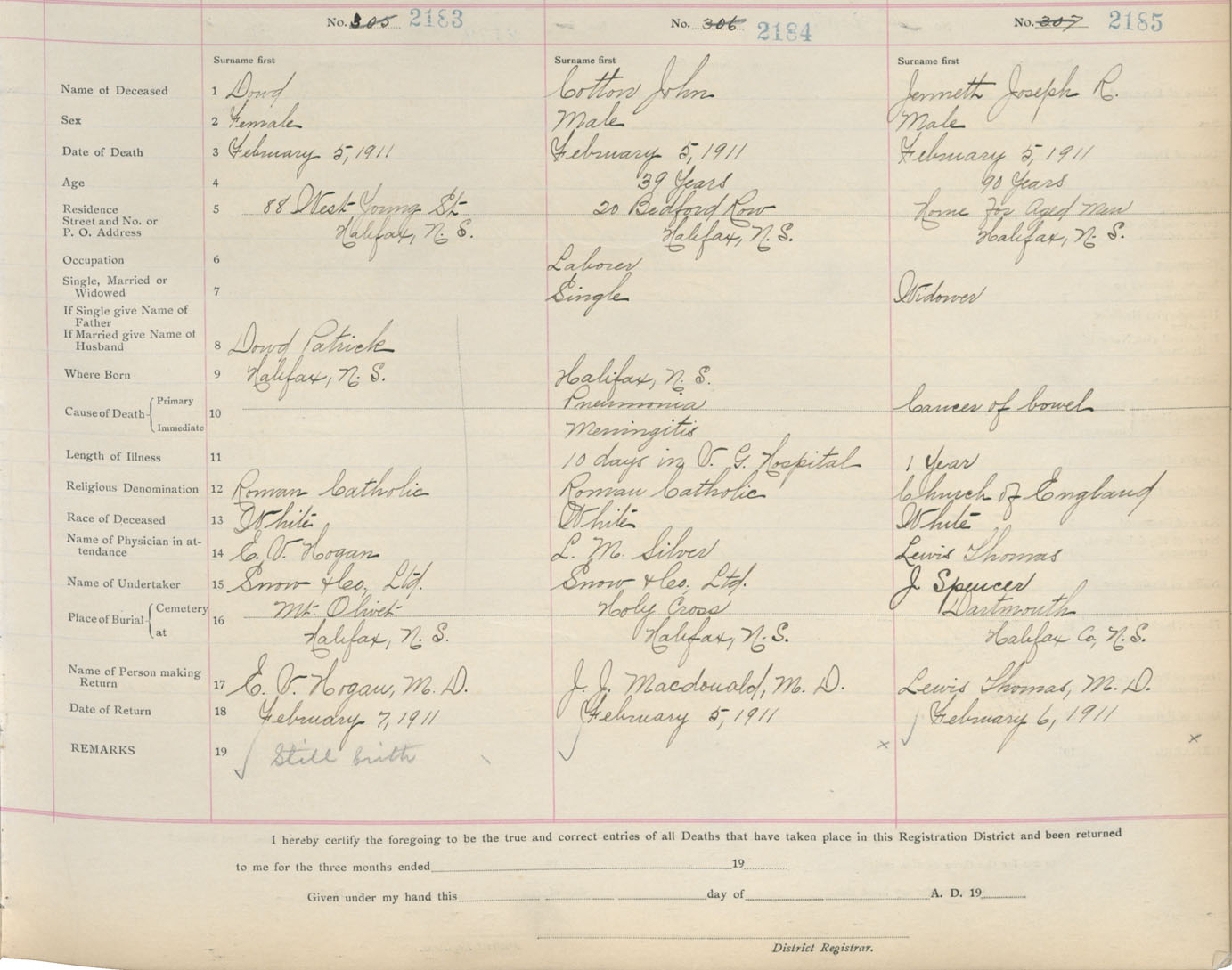 Death Registration: Year: 1911 book: 8 page: 364 number: 2185