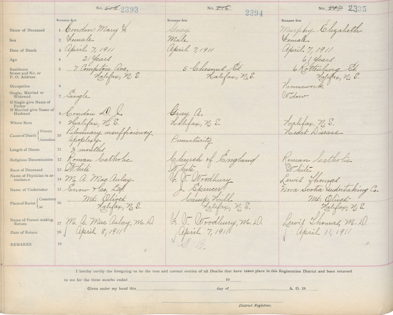 Death Registration: Year: 1911 book: 8 page: 399 number: 2395