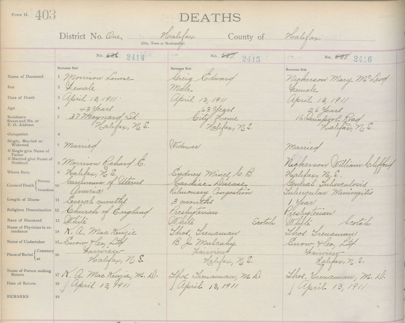 Death Registration: Year: 1911 book: 8 page: 403 number: 2416
