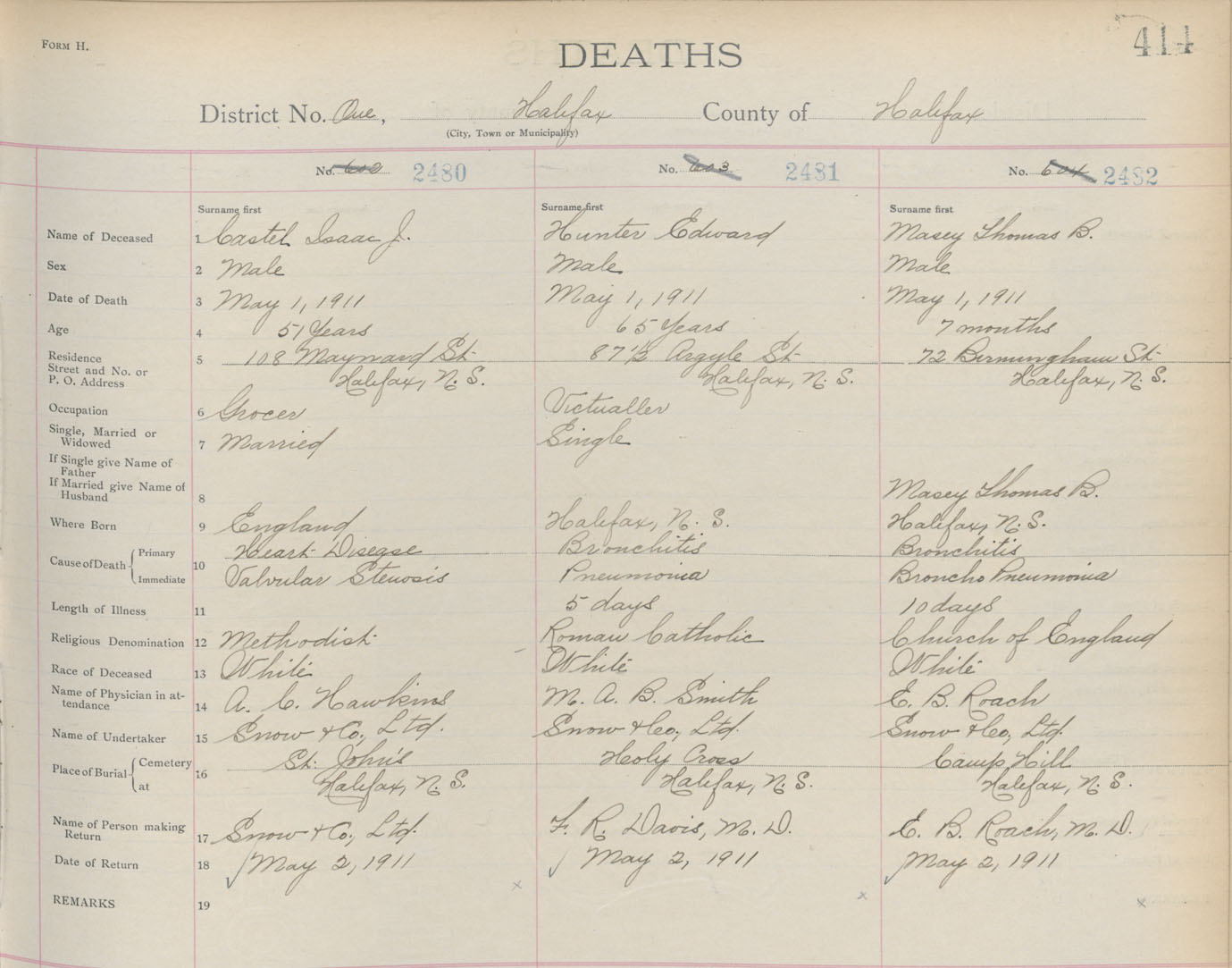 Death Registration: Year: 1911 book: 8 page: 414 number: 2482