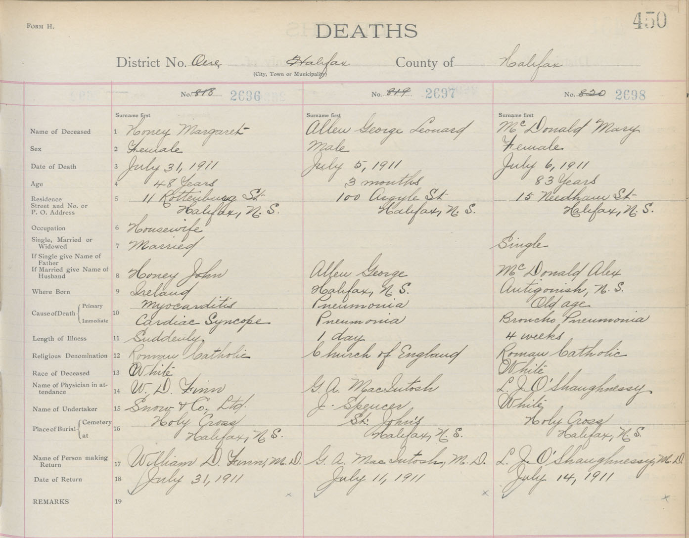 Death Registration: Year: 1911 book: 8 page: 450 number: 2696