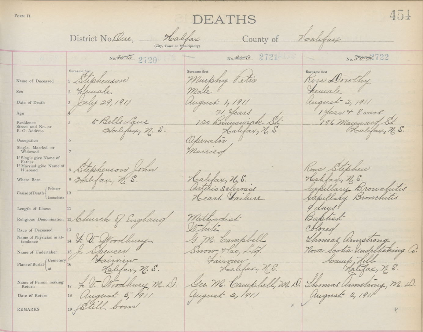 Death Registration: Year: 1911 book: 8 page: 454 number: 2720