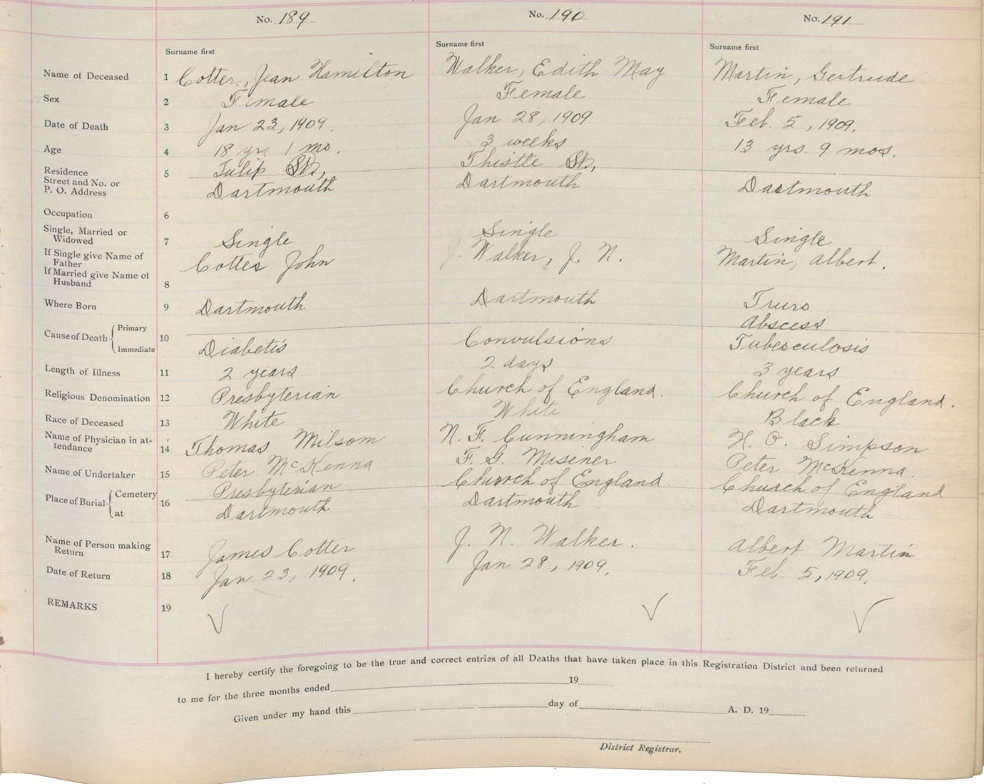 Death Registration: Year: 1909 book: 9 page: 32 number: 191