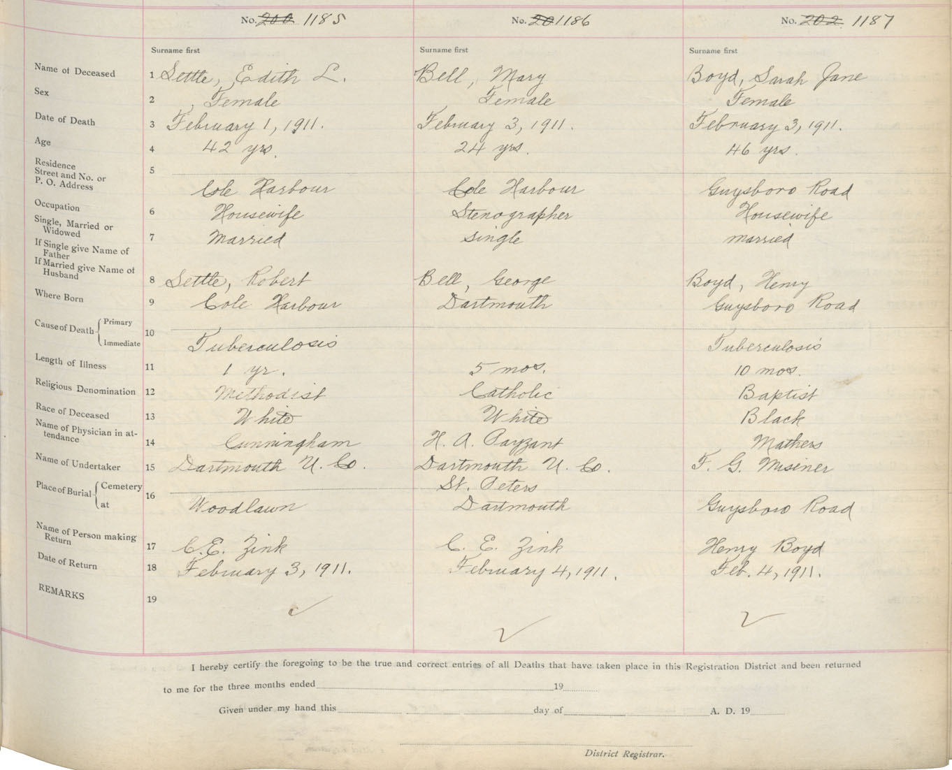 Death Registration: Year: 1911 book: 9 page: 198 number: 1185