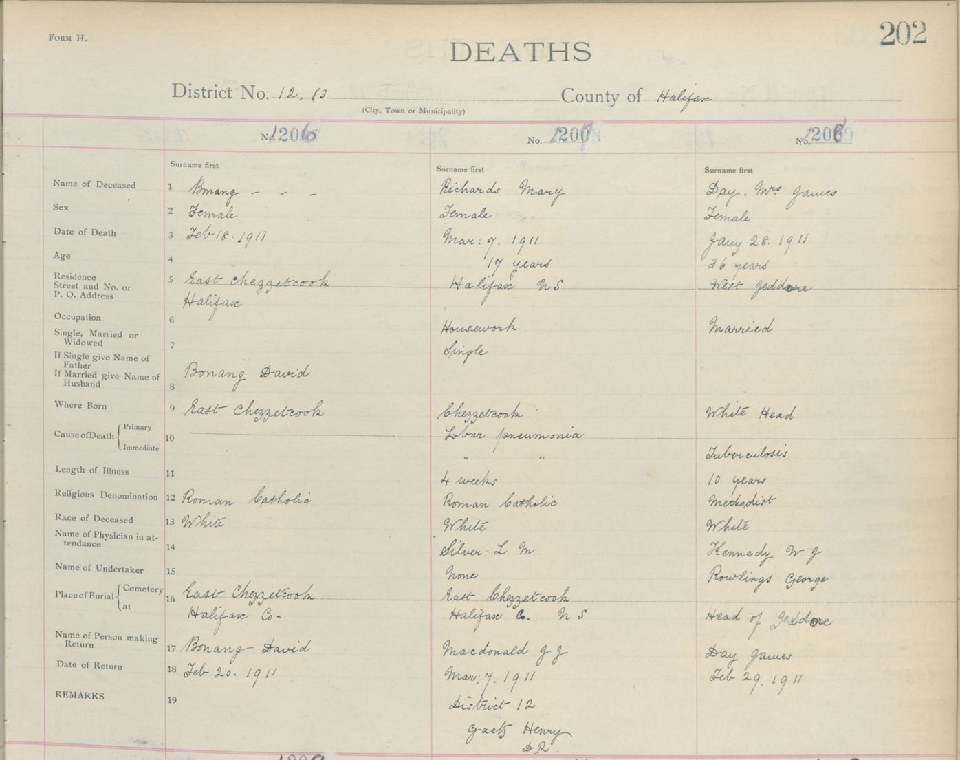 Female Death Registration: Year: 1911 book: 9 page: 202 number: 1206