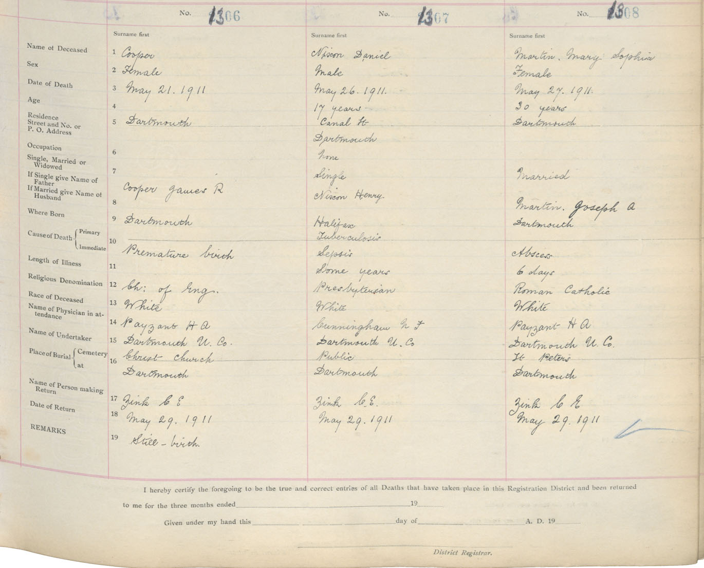 Female Death Registration: Year: 1911 book: 9 page: 218 number: 1306