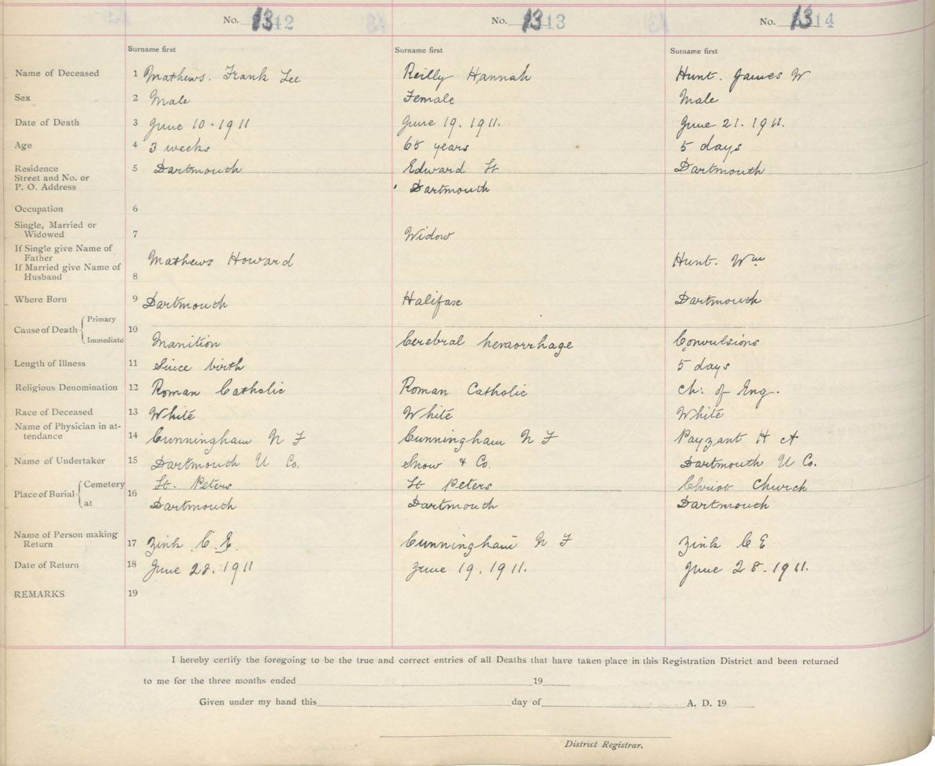 Death Registration: Year: 1911 book: 9 page: 219 number: 1312