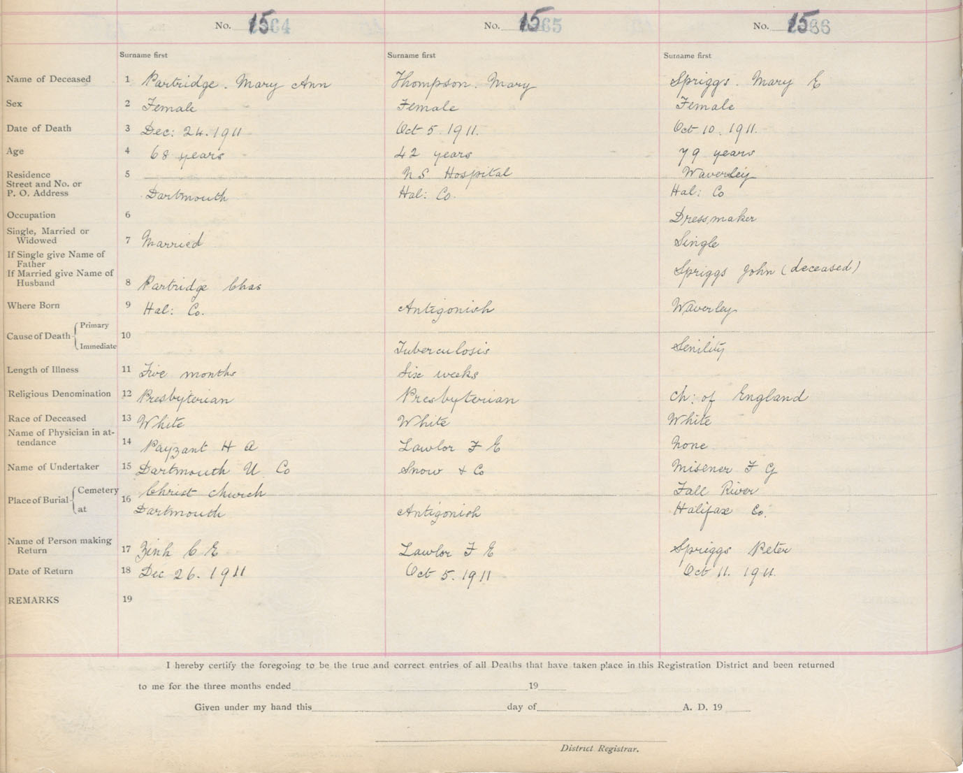 Death Registration: Year: 1911 book: 9 page: 261 number: 1566