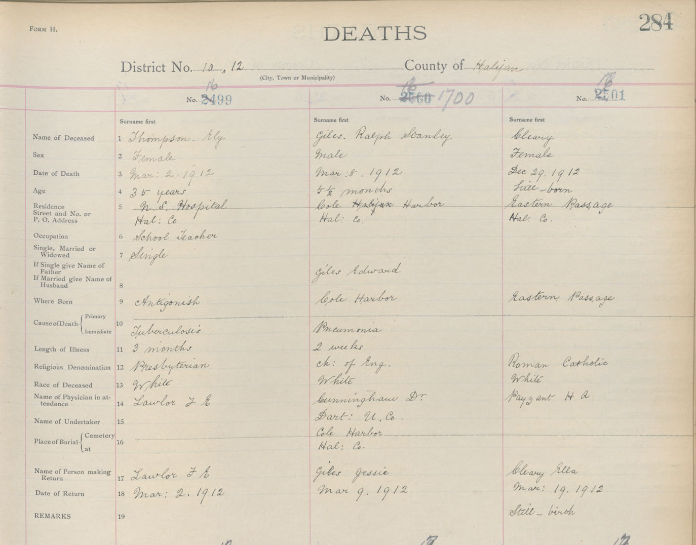 Female Death Registration: Year: 1912 book: 9 page: 284 number: 1701