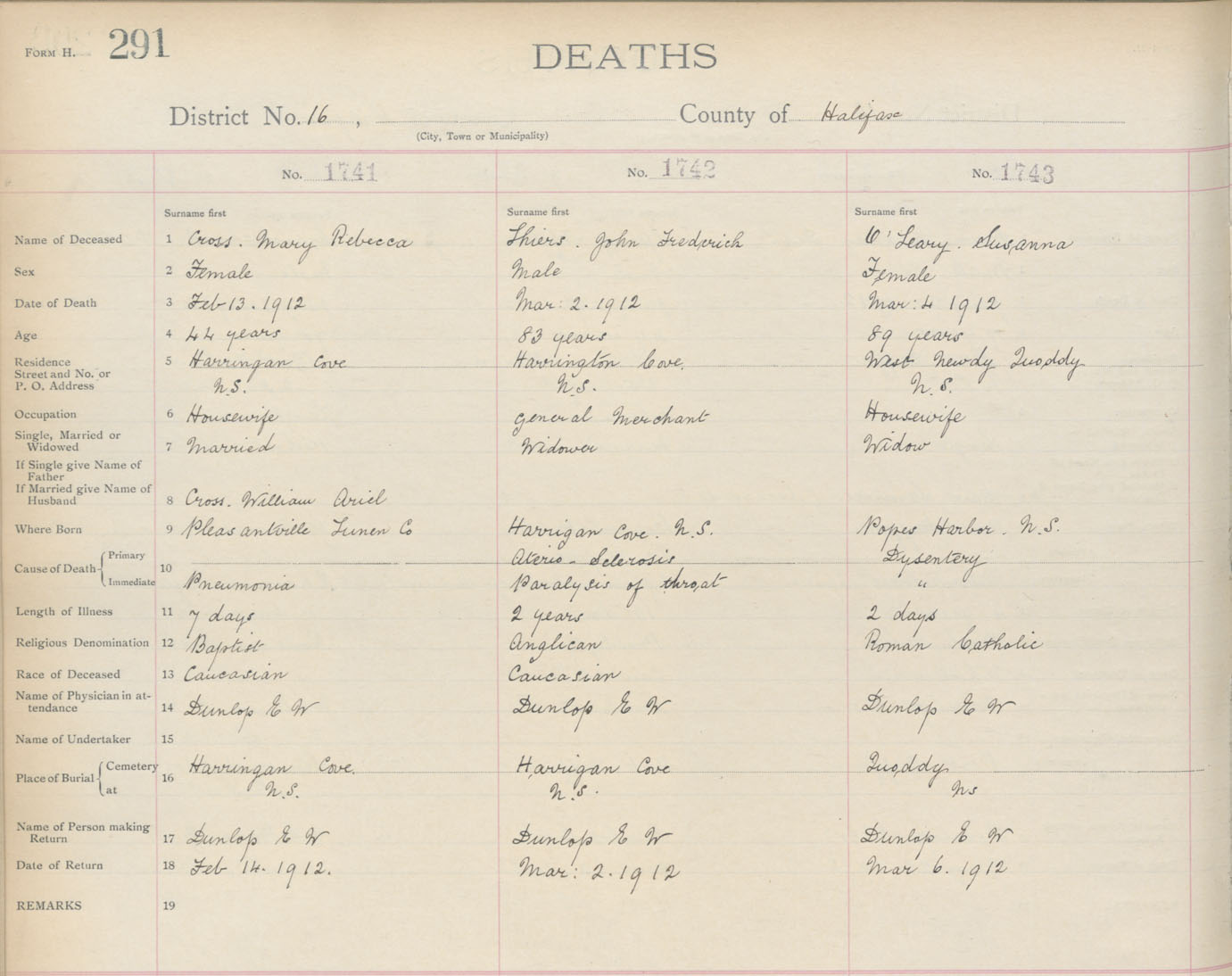 Death Registration: Year: 1912 book: 9 page: 291 number: 1743