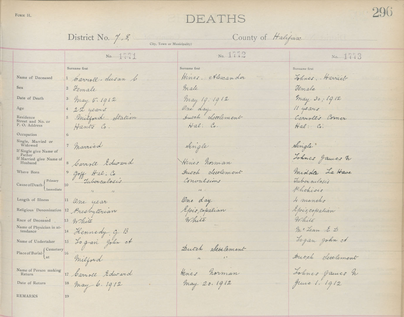 Death Registration: Year: 1912 book: 9 page: 296 number: 1773