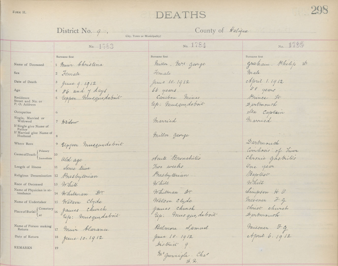 Death Registration: Year: 1912 book: 9 page: 298 number: 1785