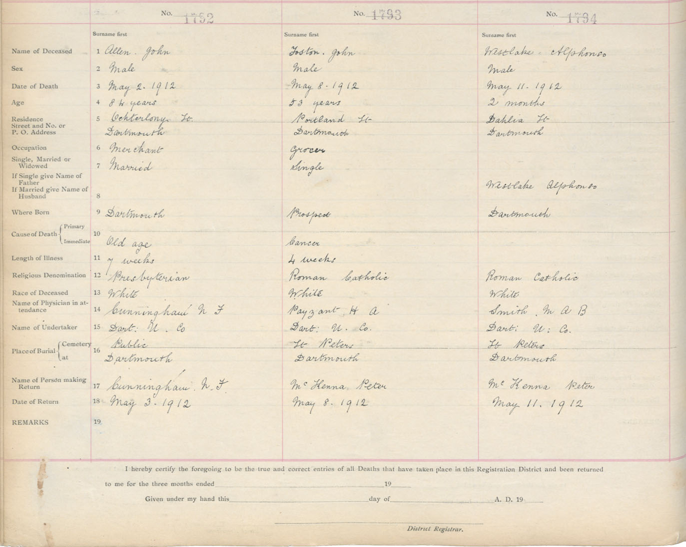 Death Registration: Year: 1912 book: 9 page: 299 number: 1794
