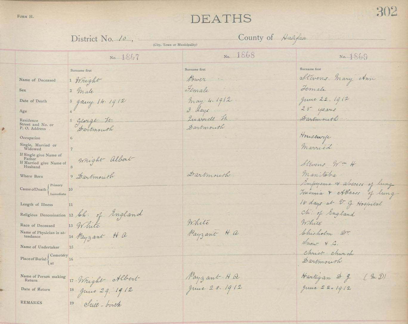 Death Registration: Year: 1912 book: 9 page: 302 number: 1809