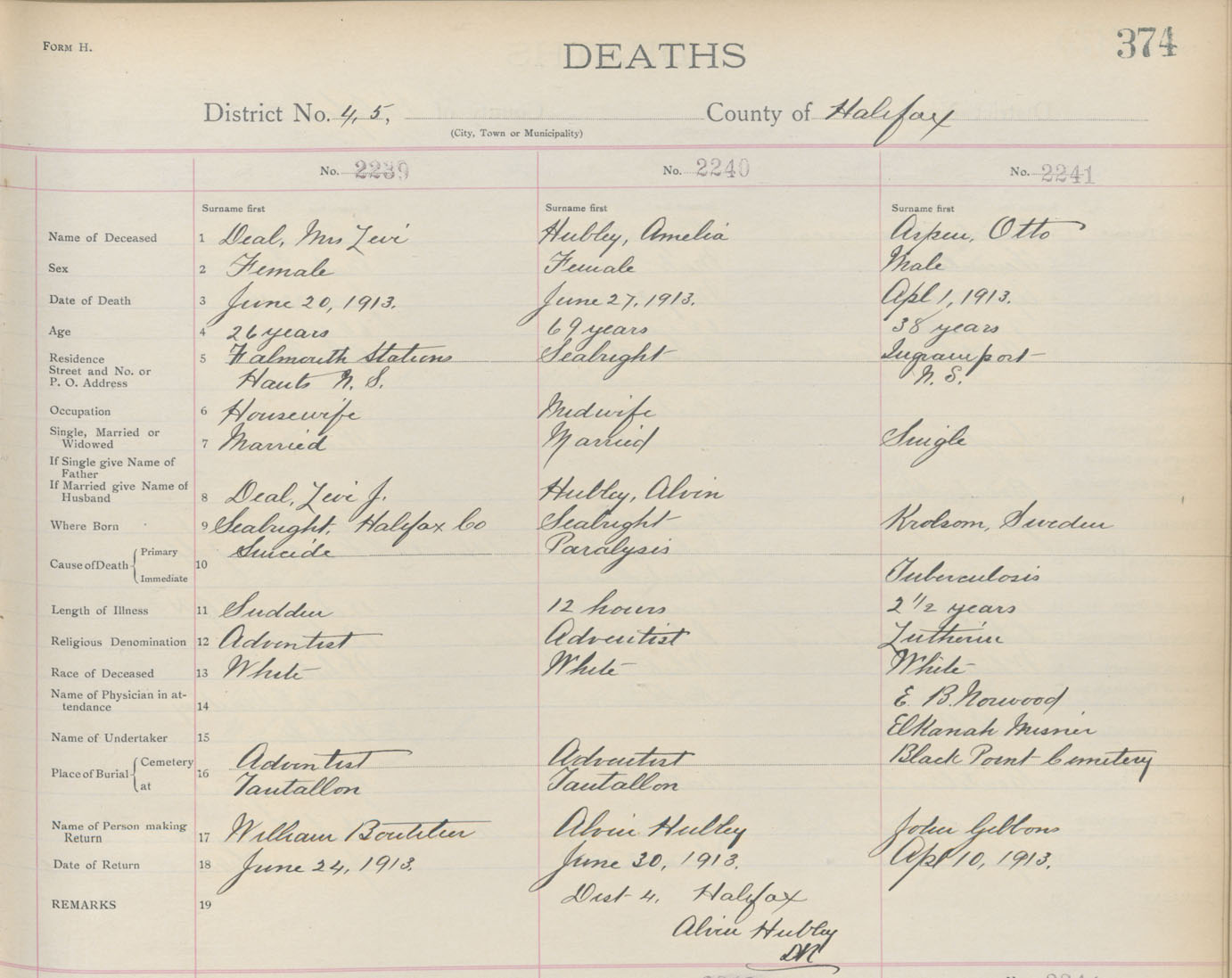 Death Registration: Year: 1913 book: 9 page: 374 number: 2239