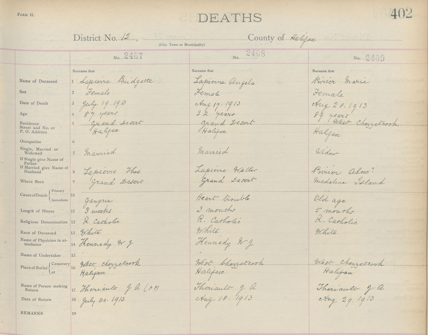 Death Registration: Year: 1913 book: 9 page: 402 number: 2407