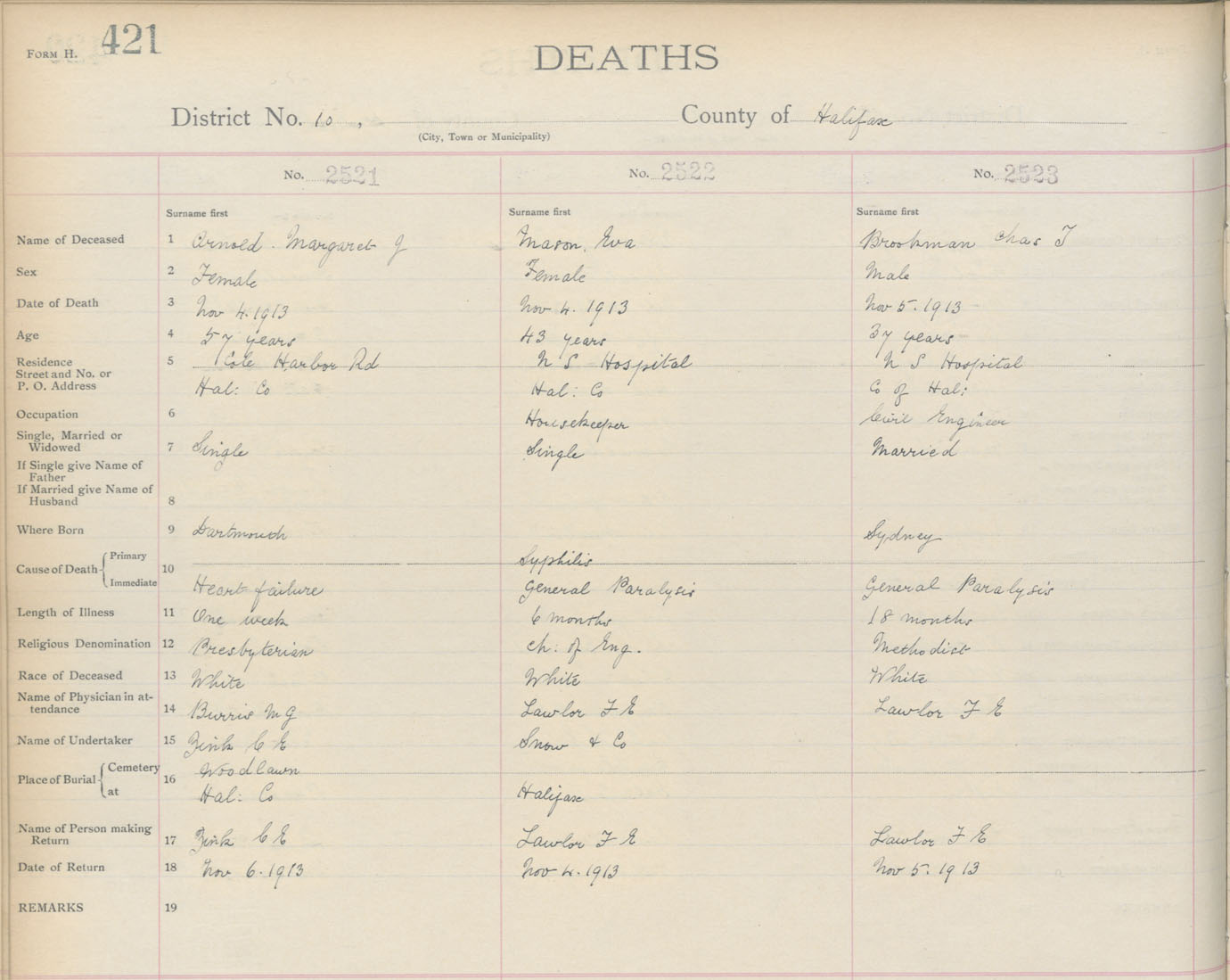 Death Registration: Year: 1913 book: 9 page: 421 number: 2521