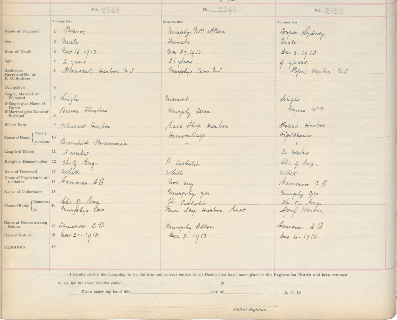 Male Death Registration: Year: 1913 book: 9 page: 425 number: 2548