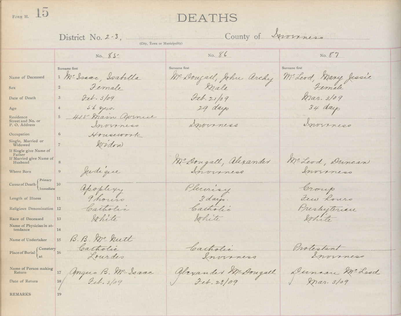 Death Registration: Year: 1909 book: 11 page: 15 number: 85