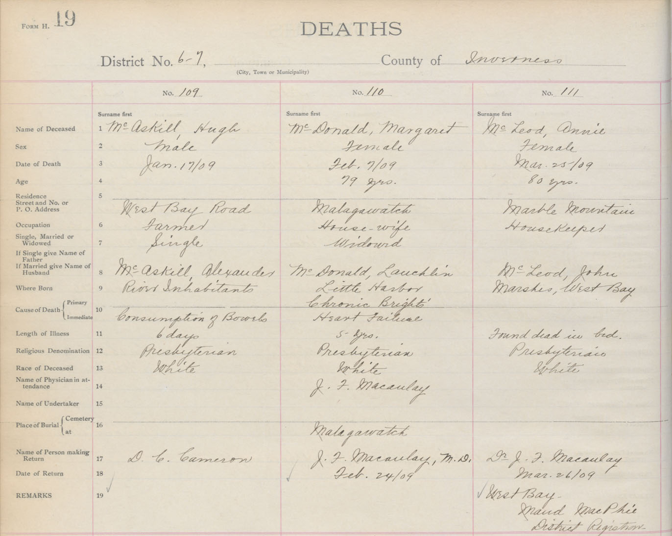 Death Registration: Year: 1909 book: 11 page: 19 number: 109