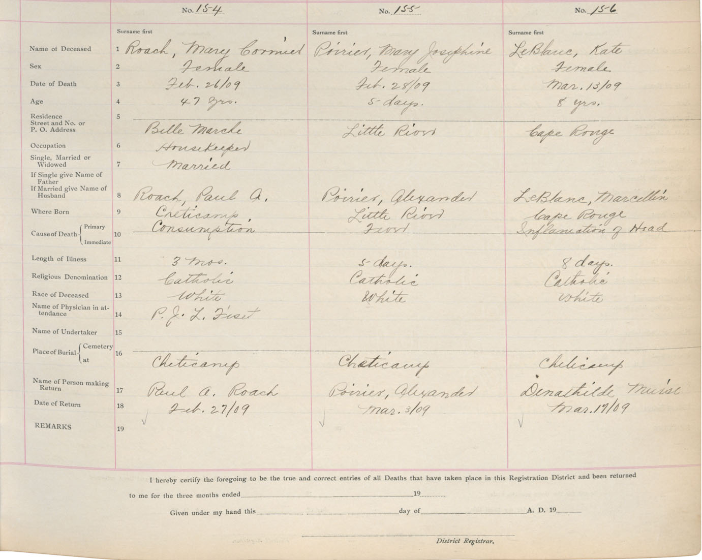 Death Registration: Year: 1909 book: 11 page: 26 number: 156