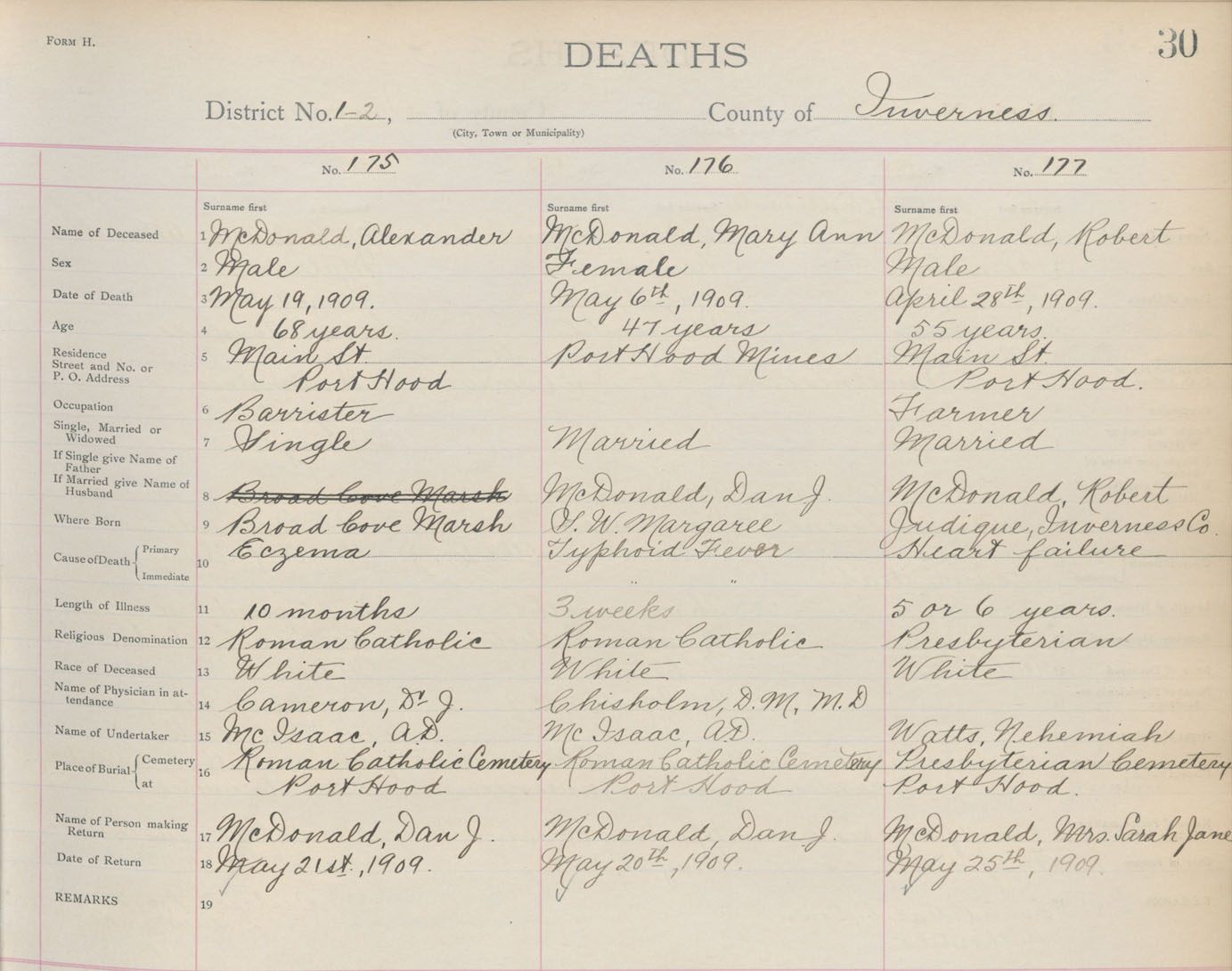 Death Registration: Year: 1909 book: 11 page: 30 number: 177