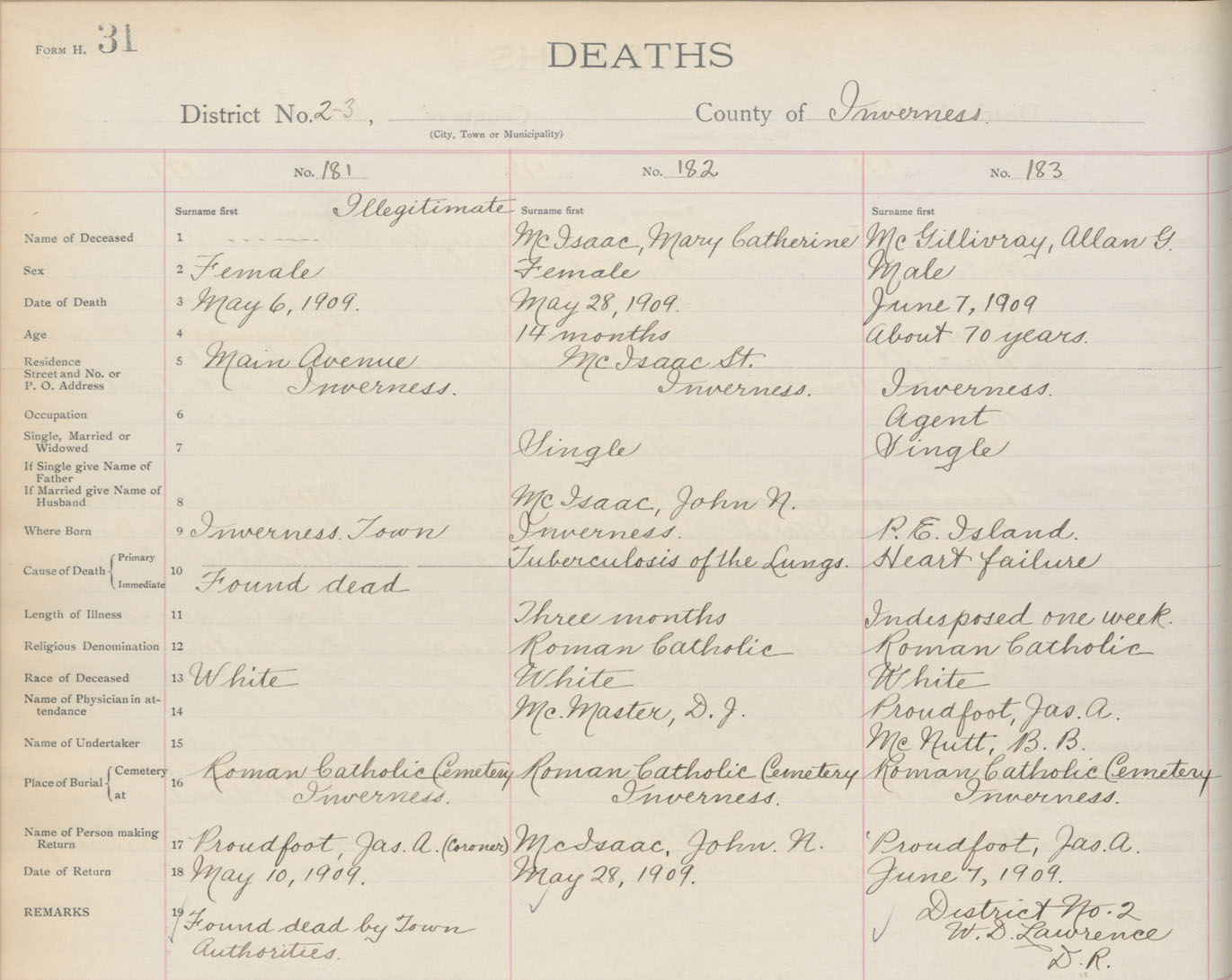 Death Registration: Year: 1909 book: 11 page: 31 number: 183