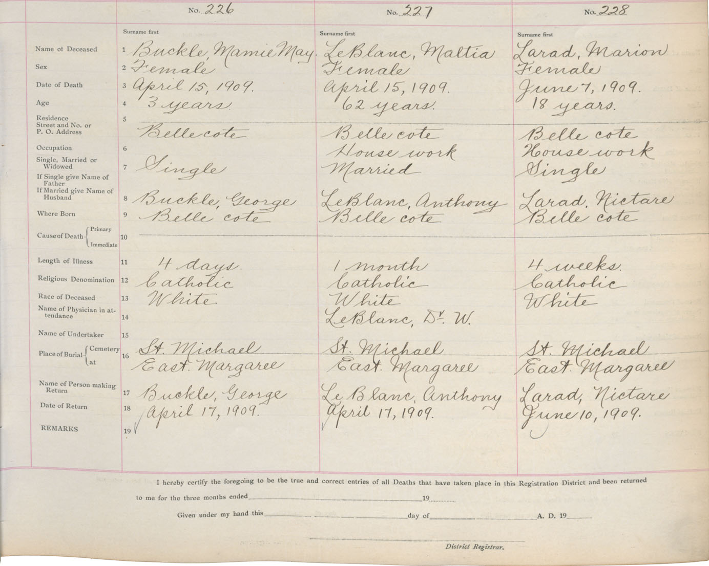 Death Registration: Year: 1909 book: 11 page: 38 number: 226