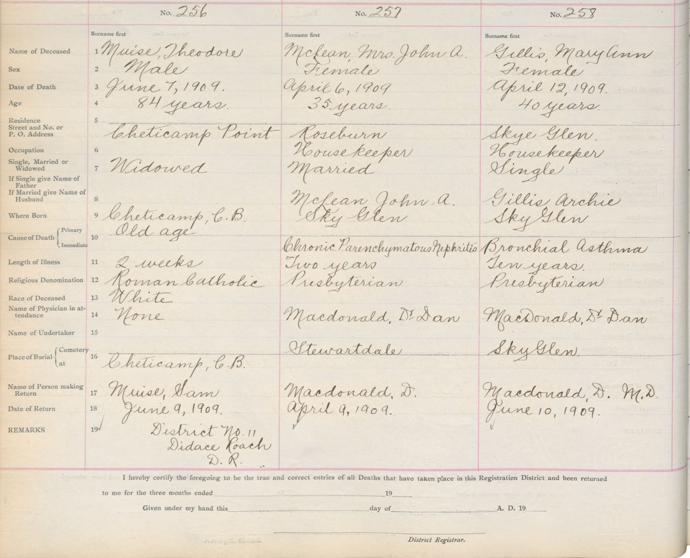 Death Registration: Year: 1909 book: 11 page: 43 number: 258