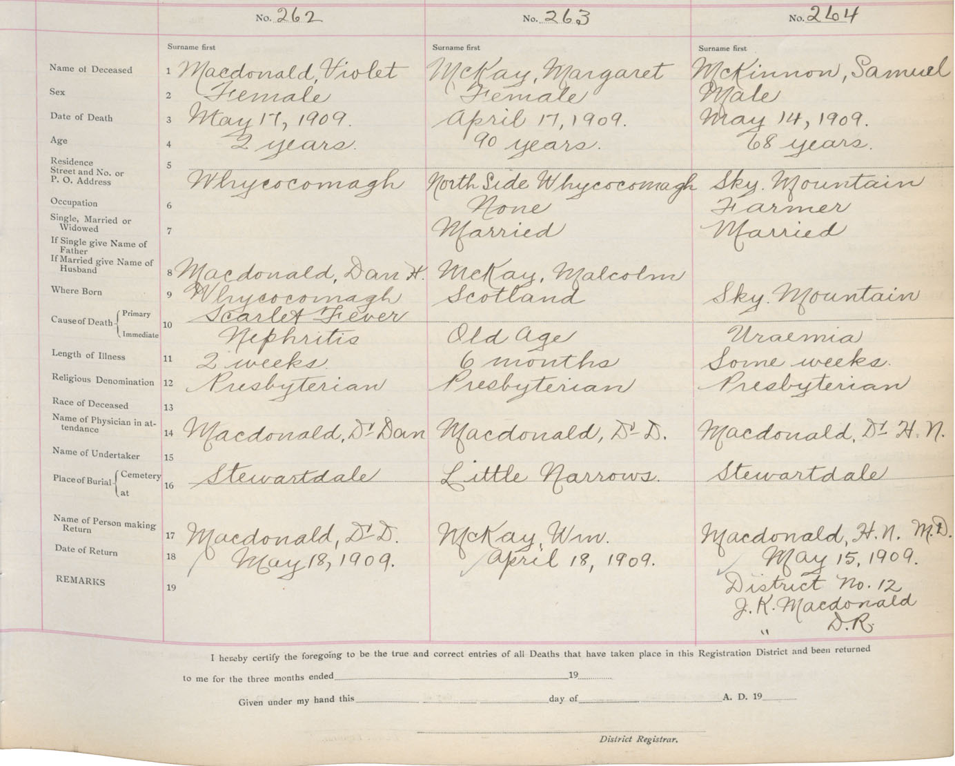 Death Registration: Year: 1909 book: 11 page: 44 number: 262