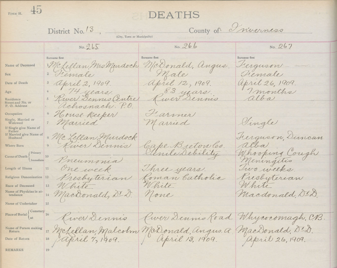 Death Registration: Year: 1909 book: 11 page: 45 number: 265