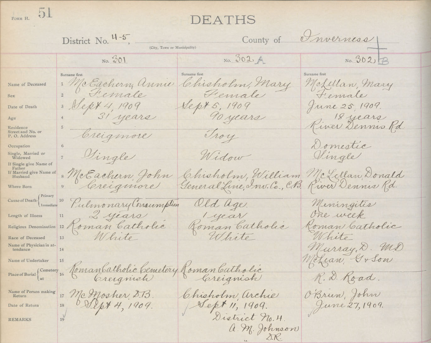 Death Registration: Year: 1909 book: 11 page: 51 number: 301