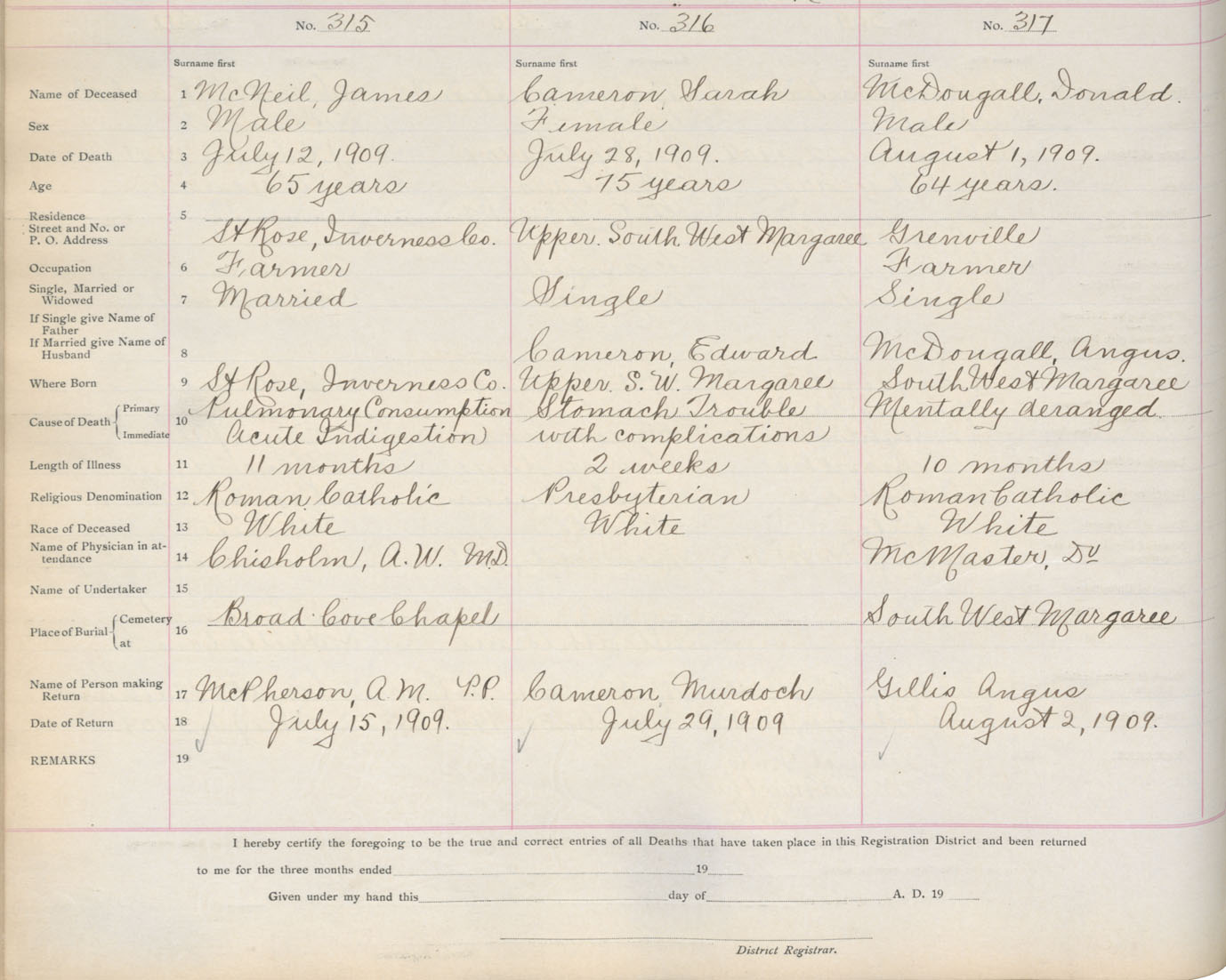 Death Registration: Year: 1909 book: 11 page: 53 number: 315
