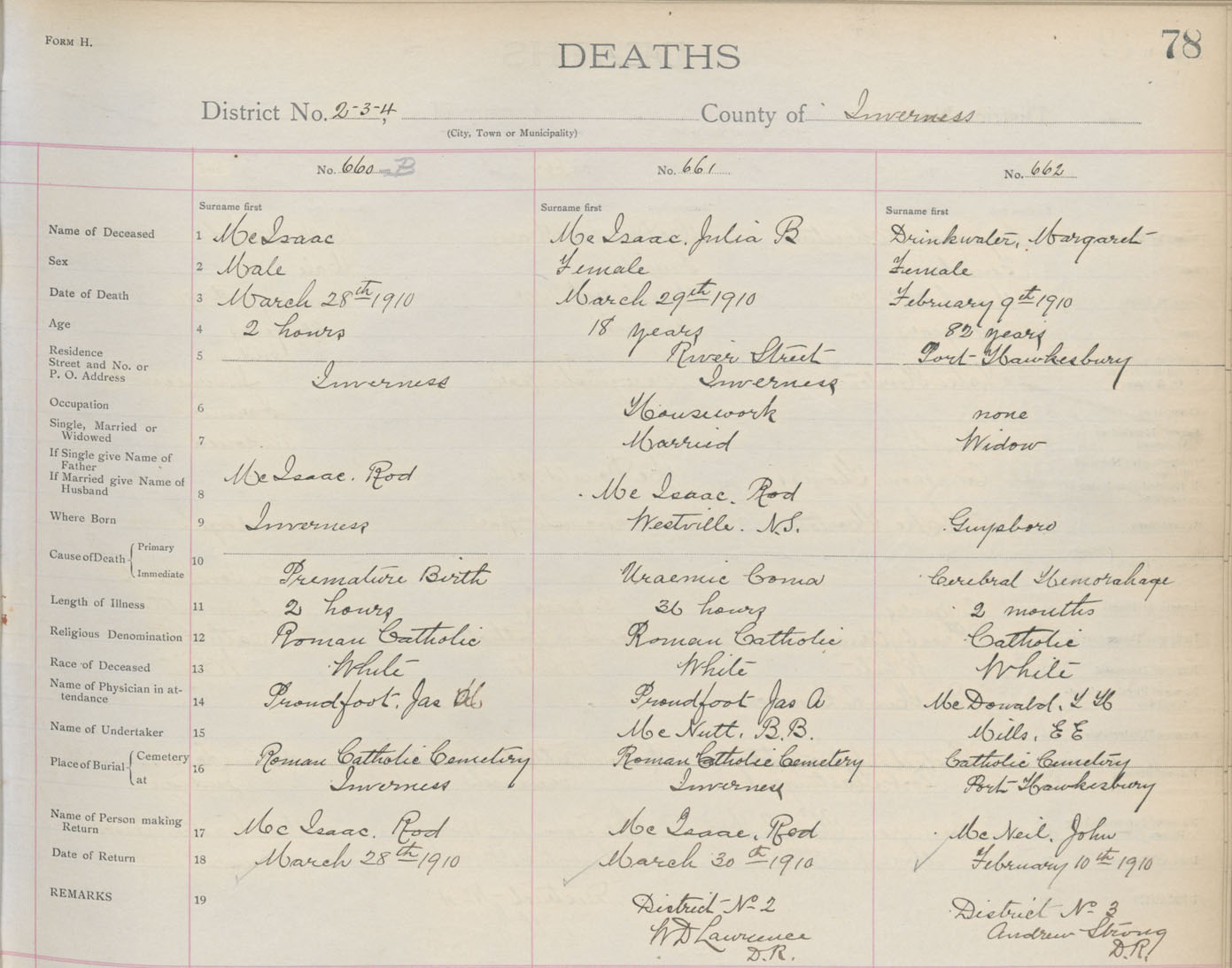 Male Death Registration: Year: 1910 book: 11 page: 78 number: 660