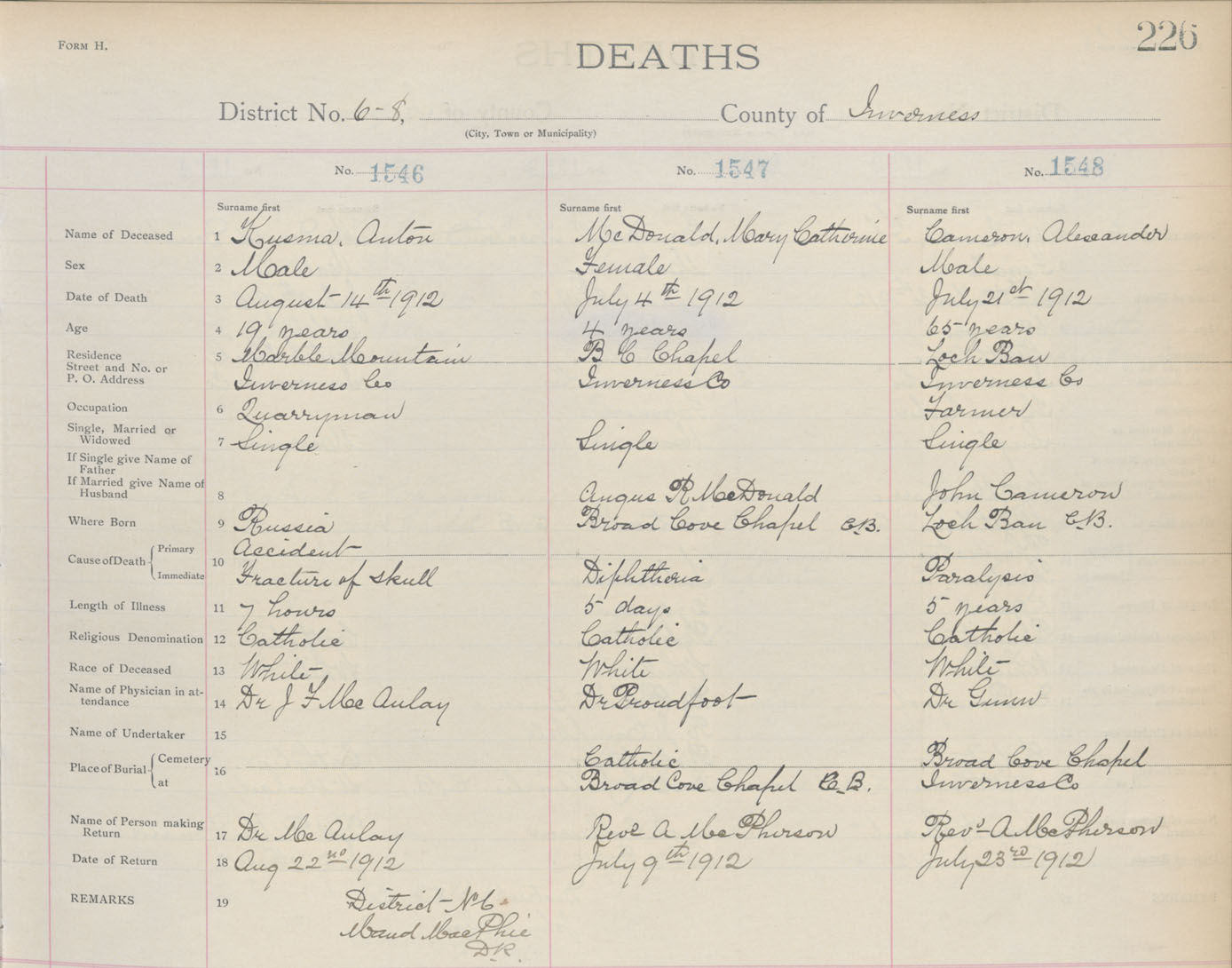 Death Registration: Year: 1912 book: 11 page: 226 number: 1548
