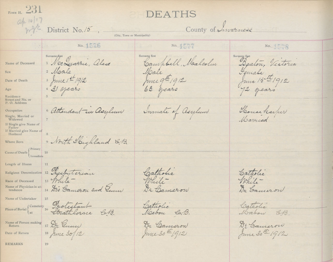 Death Registration: Year: 1912 book: 11 page: 231 number: 1578