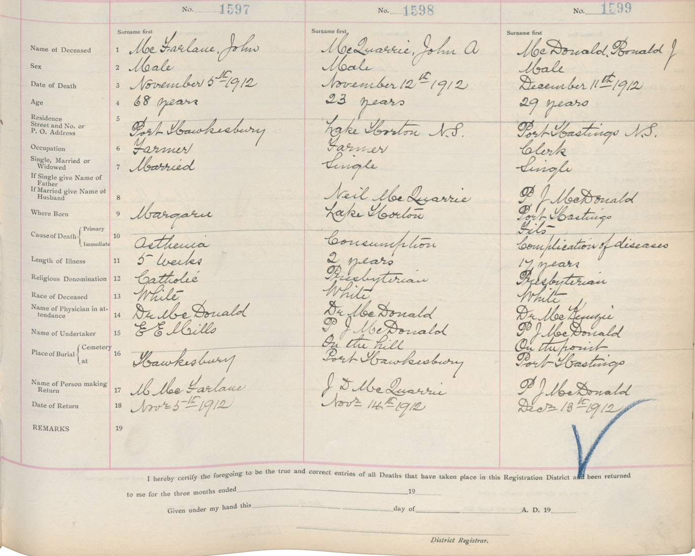 Death Registration: Year: 1912 book: 11 page: 234 number: 1599