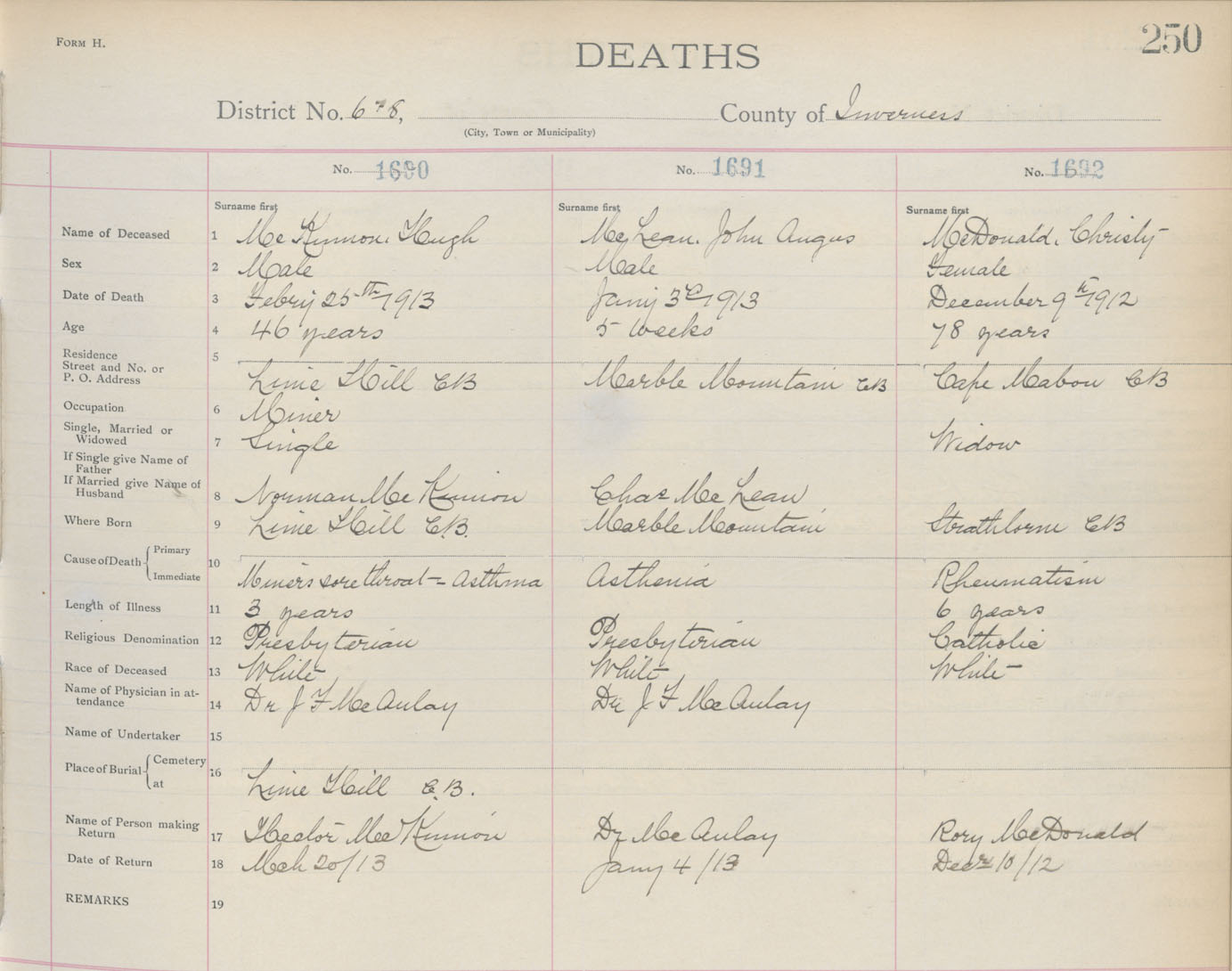 Death Registration: Year: 1913 book: 11 page: 250 number: 1692