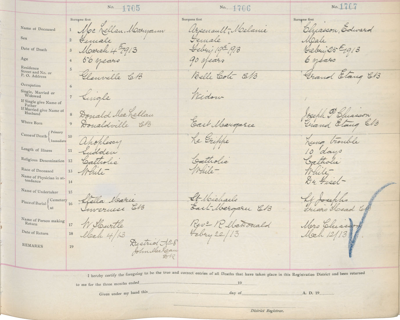 Death Registration: Year: 1913 book: 11 page: 252 number: 1707