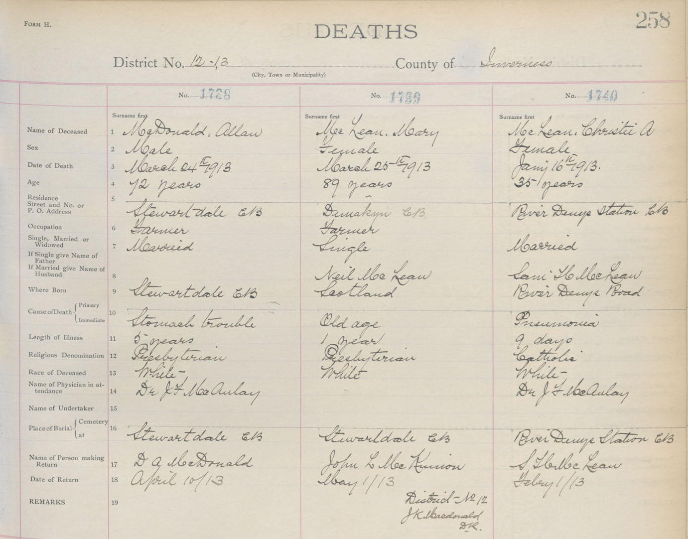 Death Registration: Year: 1913 book: 11 page: 258 number: 1740